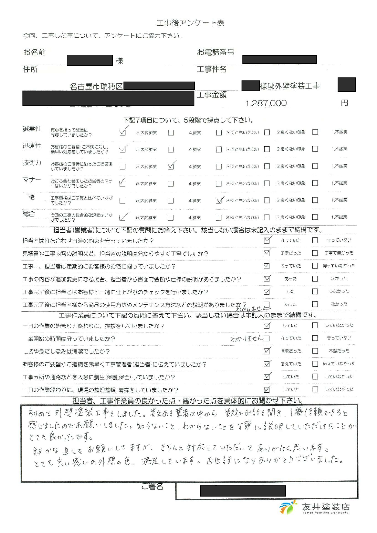 2025.11.11 外壁塗装 名古屋市瑞穂区 外壁塗装工事 A様 初めて外壁塗装工事をしました。数ある業者の中から数社お話を聞き、一番信頼できると感じましたのでお願いしました。知らないこと、わからないことを丁寧に説明していただいたことがとても良かったです。 細かな直しをお願いしましたが、きちんと対応していただいてありがたく思います。とても良い感じの外壁の色、満足しています。お世話になりありがとうございました。