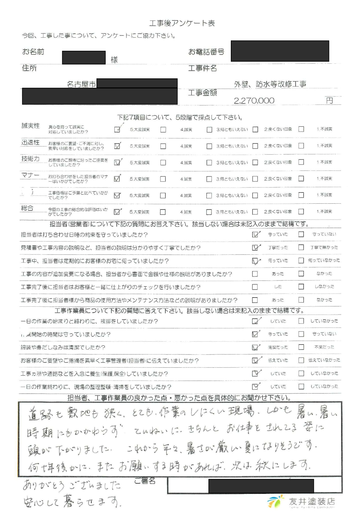 2025.11.11 防水塗装 名古屋市 防水等改修工事 K様 道路も敷地も狭く、とても作業しにくい現場、しかも暑い暑い時期にもかかわらず、ていねいに、きちんとお仕事をされる姿に頭が下がりました。これから年々暑さが厳しい夏になりそうです。何十年後かに、またお願いする時があれば、次は、秋にします。 ありがとうございました。安心して暮らせます。